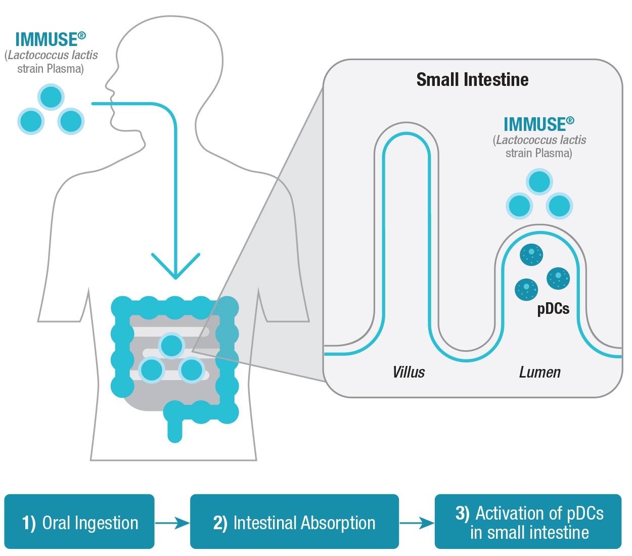 Once taken, IMMUSE makes its way through the GI tract to the small intestine where specialized M cells pick up the small particles and transport them into the Peyer’s Patches. The small particles of IMMUSE directly activate pDCs, subsequently stimulating multiple types of immune cells, which then circulate throughout the body strengthening overall immune defense from the inside out.